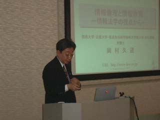 近畿大学や関西大学等で講師をされている弁護士の岡村久道先生からは,「情報倫理と情報教育−情報法学の視点から−」のテーマで講演をいただきました。情報法学の視点で,情報社会の諸相や情報セキュリティーの基本的な考え方などを,永年のご研究に基づき,具体的な事例を数多く挙げていただきながらお話しされ,示唆に富む講演で感銘を受けました。 |