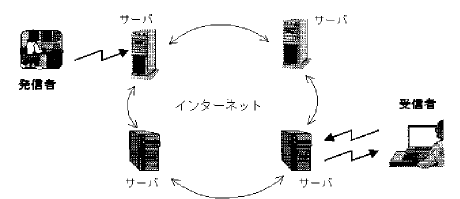 また,相手に情報が届くのに必要な時間も大幅に短縮できる.途中経由するネットワークに障害がなければ,ほんの数秒で相手先に届く.これは相手が地球の裏側にいても同じである.速達を利用しても最低一日はかかる郵便物とは比べ物にならない.電子メールの送受信のために電話線を利用することが多いが,例えば海外に住む人に電子メールを送信するときでも,国際電話を利用しているわけではない.市内料金で世界中に電子メールが送れる.これは後述するように電子メールは相手先まで直接送られるのではなく,途中いくつかのサーバを経由して,次々と送られていくためである(図2.1).送信者の負担は最初のサーバコンピュータまでだけでよい.