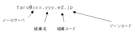 例えば,図2.2に示す taro@xxx.yyy.ed.jpというメールアドレスの場合,@より前が「受取人」,@より後ろがサーバの「所在地」 にあたるので,「xxx.yyy.ed.jpに所属するtaroという人」という意味である.所在地といってもサーバの機械がおいてある具体的な地名を示しているのではなく,インターネットに接続されているコンピュータの名前で,正しくはドメインネームという.