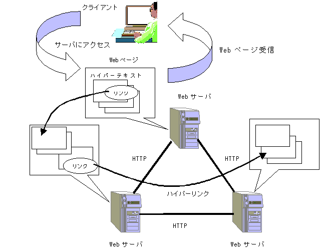 文章の構造を記述するHTML(Hyper Text Markup Language)言語で書かれた情報をインターネットサーバ上の Web サーバに格納し,インターネット上にある端末で Web ブラウザからURL(Uniform Resource Locator)で指定された Web サーバを呼び出し,呼び出されたサーバはHTTP(Hyper Text Transfer Protocol)という規約で情報を送出し, Web ブラウザが受信して端末に表示を行う.