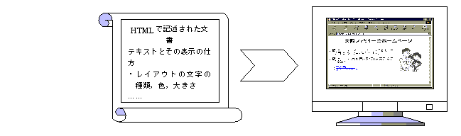いい換えると,情報というものは与えられるだけでなく,双方向的に受け渡しするのが理想的な姿であろう.また,自分の作成したWebページに電子メール機能を付けておくと,見てもらったネットワーカーから情報や意見を集めることができる.すなわち,情報収集としての効用も発揮することができる.Webブラウザは,HTMLに記述されている指示に従ってWebページを画面表示する(図2.6).自分のWebページを作成するときに,自分の作成した範囲内だけで内容を閉じてしまうのは,インターネットの性質をうまく利用しているとはいえない.自分が作成した内容には必ずそれに関連したWebページがあるはずである.自分のWebページから,それらのページにリンクすることは,自分のWebページを訪れてくれた人に対する親切のひとつである.ただ,その時にも守らないといけないルールがある.それは,他人のWebページにリンクするときには,リンクをはる相手に対して,原則として承認を得なければならないということである.